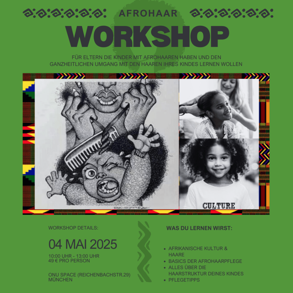 Du bist Elternteil eines Kindes mit Afrohaaren und möchtest lernen, wie du die Haare deines Kindes richtig pflegst und dabei seine kulturelle Identität stärkst? Dann ist dieser Workshop genau das Richtige für dich!